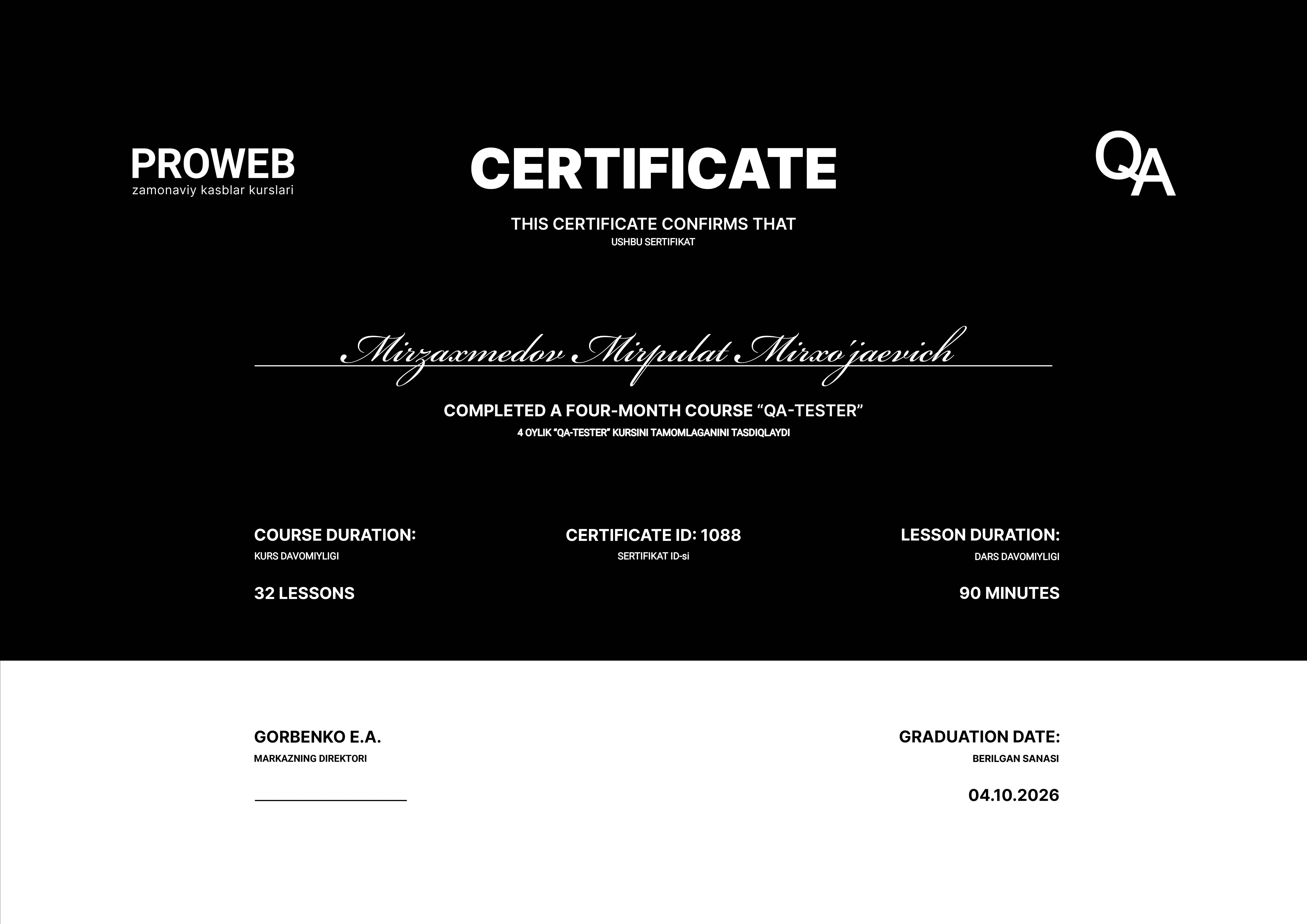 Test Keyslar, Bug - Reportlar yaratishni, API testlovlarini o`tkazishni, testlarni avtomatlashtirishni, SQL, CI/CD pipeline bilan ishlashni va brauzerlararo va mobil sinovlarni o'zlashtirishni o'rganasiz.